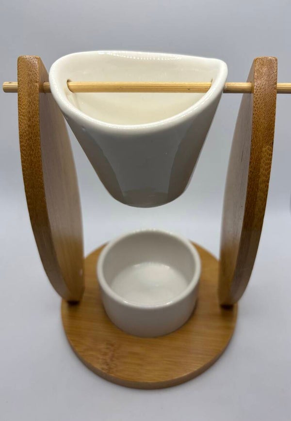 Le Brûle-parfum Voile dispose d’un support en bois avec une vasque en céramique pouvant accueillir des huiles essentielles, des parfums d’ambiance ou de la cire parfumée.